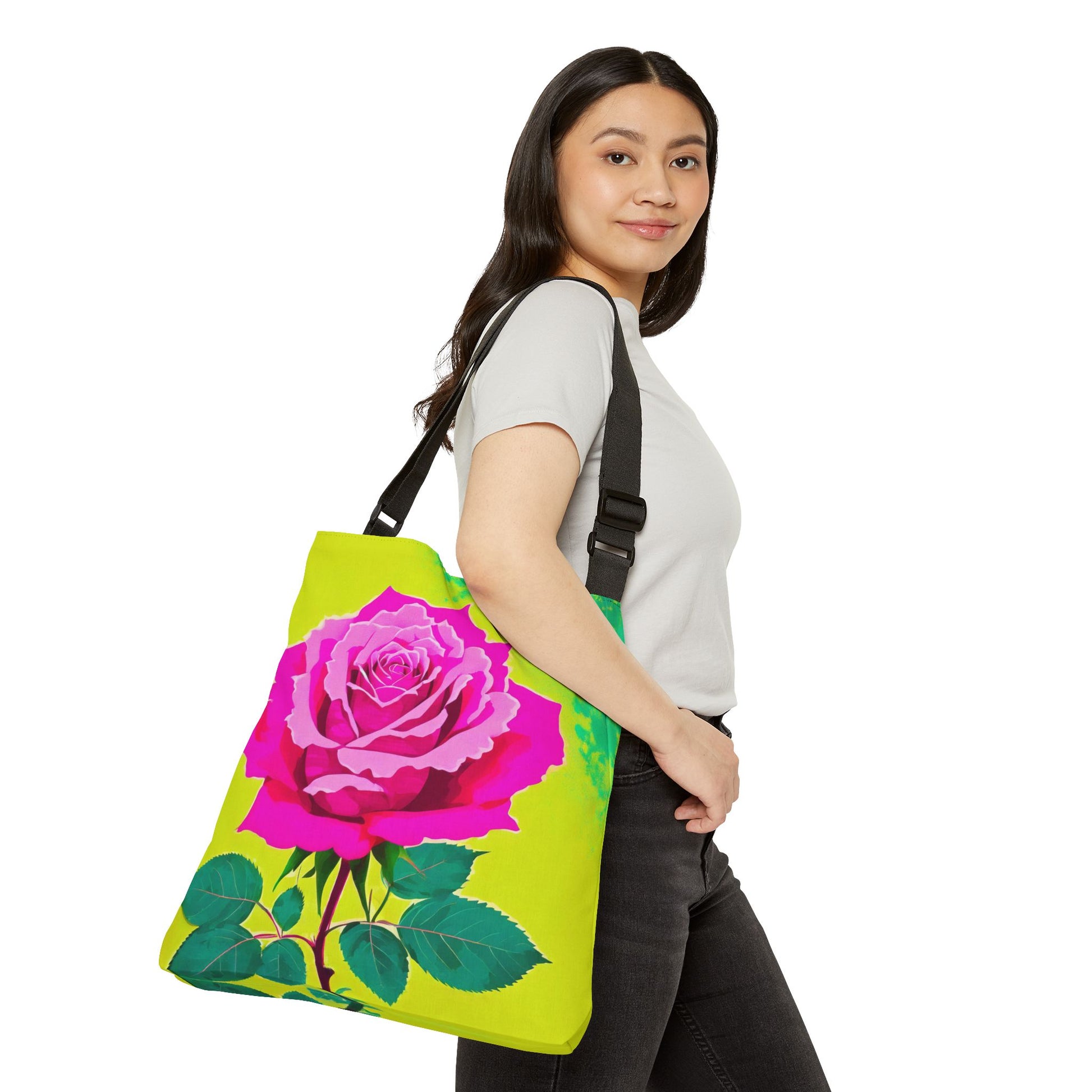 A pink rose on an acid green background gives a vibrant and eye-catching look to this tote bag. Perfect for those who love floral designs and want to add a pop of color to their wardrobe. Ideal for casual wear or as a statement piece for special occasions like birthdays or anniversaries.