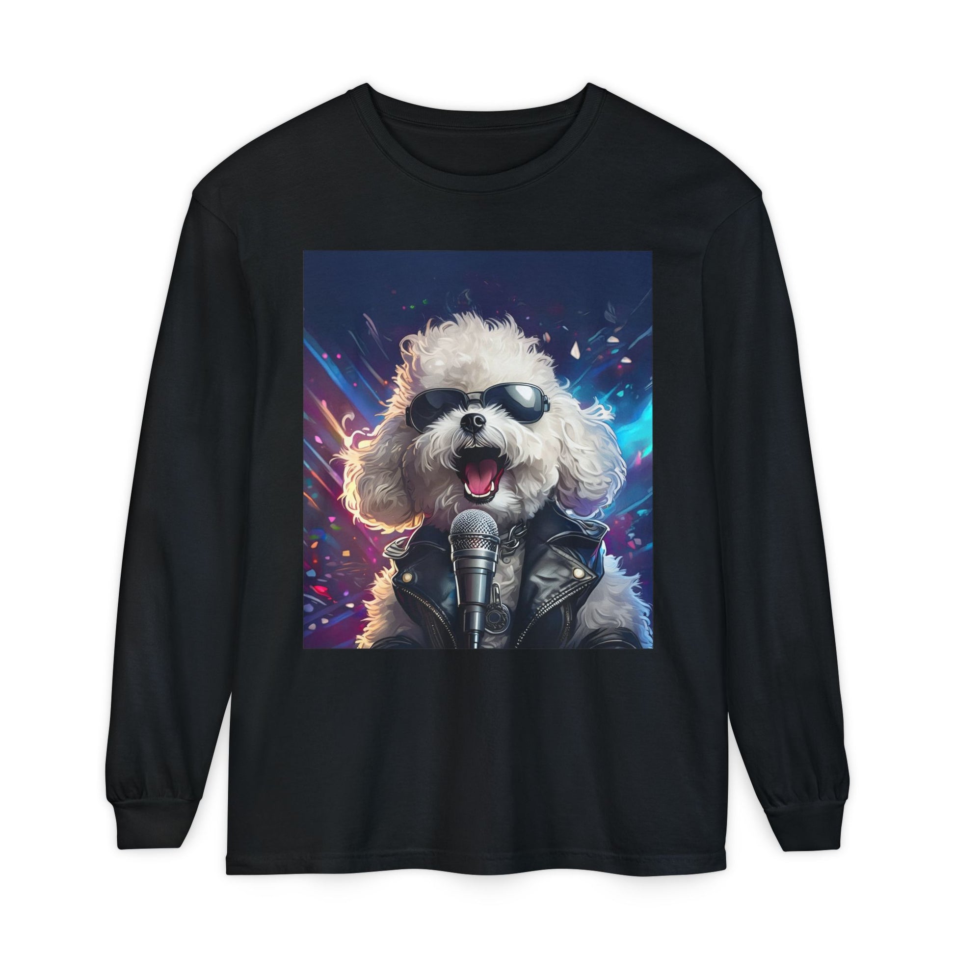 This T-Shirt features a rockin' little white dog belting it out at a microphone, giving off a fun and lively vibe. Perfect for music lovers, dog enthusiasts, or anyone looking to add a playful touch to their wardrobe. Great for casual wear, music festivals, or themed parties.